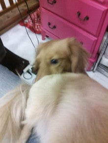 なぜかズボンの縫い目を噛んで引っ張るクッキー。