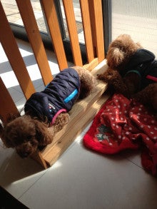 定位置で日向ぼっこをする親子