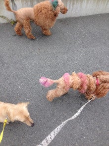 手前のピンクのプードルは